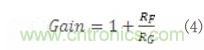 公式4用于計算放大器反饋網(wǎng)絡中的電阻RF和RG的大小,以此來設置公式3中計算出的增益: