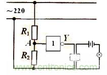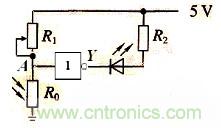 隨著城市化進程的加快發展,城市建設也趨于現代化、人文化、科技化,城市道路兩旁的路燈也成了一座城市獨特的風景線,其自動控制不但節省人力,還節約了能源。如圖所示是自動控制路燈的邏輯電路原理圖,其中R0是光敏電阻,光越強烈,光敏電阻R0的阻值越小,R1與R0串聯時所分的電壓就越小,A點輸入低電位,通過非門后,輸出端Y為高電位,所以路燈自動熄滅。光越微弱,光敏電阻R0的阻值越小,R1與R0串聯時所分的電壓就越大,A點輸入高電位,通過非門后,輸出端Y為低電位,所以路燈自動接通。