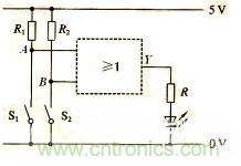 汽車給人們的出行帶來方便、舒適,但其安全性也很重要。如圖所示為簡單的車門報警電路圖。圖中的兩個按鈕開關S1、S2分別裝在汽車的兩道門上。駕駛員離開汽車時,兩車門均處于關閉狀態,跟兩車門對應的開關S1、S2均閉合,即輸入邏輯均為0,那么輸出也是邏輯0,電流不通過發光二極管,這時發光二極管不會發光報警;只要其中任何一個車門打開時,S1或S2就處于斷開狀態,即輸入為邏輯1,那么輸出也是邏輯1,這時就有電流通過發光二極管,使其發光報警。如果有四個門,原理也是一樣,通過指示燈發光報警就可以判斷門是否都關好了。