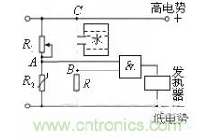 許多家庭都安裝了電熱水器,它給人們的生活帶來了方便。如圖所示是電熱水器系統的恒溫器集成電路。R1為調溫電阻,R2為熱敏電阻。“與”門電路的兩個輸入端分別接上一個水位傳感器和一個水溫傳感器。當水箱充滿水時,B點為高電壓(即輸入為邏輯1),R2為熱敏電阻,溫度越低,熱敏電阻的阻值越大,兩端的分壓越大,當電壓達到一定程度時,A點為高電壓(即輸入為邏輯1),當A和B都為高電壓時,“與”門的輸出端為高電壓,電熱水器的加熱開關才會接通電源,對水箱中的水進行加熱。當溫度高于一定溫度時,R2的電阻變小,R2兩端的電壓變小,發熱器停止加熱,所以熱水器處于保溫狀態。當水箱水不滿時,或者溫度高時發熱器都不會加熱。