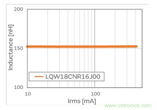 由于電感器的電流值發生變化,電感值也會發生變化。如圖2所示,LQW18CN系列對于AC電流的電感值依存性非常小。因此,即使NFC電路流通的AC電流變大,特性也不會發生很大變化。此外,如圖3 所示,即使是大電流也能保持低ACR。