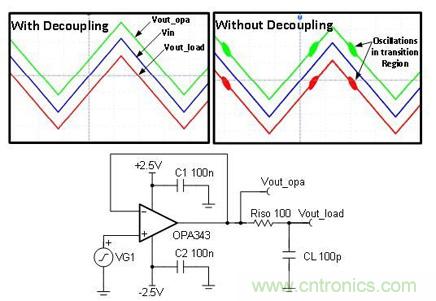 圖 1 為帶去耦電容器和不帶去耦電容器(C1 和C2)情況下用于驅動 R-C 負載的緩沖電路。我們注意到,在不使用去耦電容器的情況下,電路的輸出信號包含高頻 (3.8MHz) 振蕩。對于沒有去耦電容器的放大器而言,通常會出現穩定性低、瞬態響應差、啟動出現故障以及其它多種異常問題。