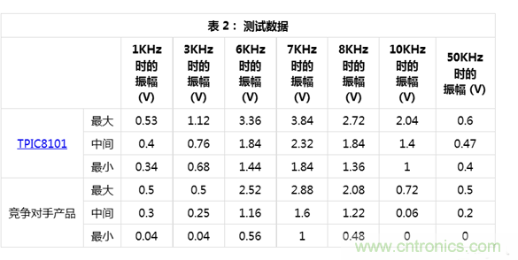 圖 2 顯示了表 1 中的結(jié)果。 噪聲等級(jí) () 在兩個(gè)器件之間大概是相同的,因?yàn)檫h(yuǎn)離中心頻率的振幅基本相同。 在中心頻率,TPIC8101 具有更高的振幅,這意味著其 SNR 要優(yōu)于競爭產(chǎn)品。