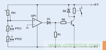 切換原理:記錄溫度限值圖3顯示為由兩個串聯正溫度系數 (PTC) 傳感器組成的一個簡單電路,。TR1與兩個正溫度系數 (PTC) 傳感器組成一個分壓器,該分壓器能夠提供運算放大器的非反相輸入,而運算放大器則充當比較器的角色。