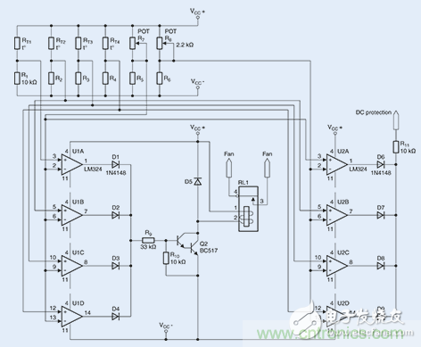 2個開關閾值的參考值將通過2個微調器,即R7和R8(分別為2.2 k?)進行設置。如上所述,兩個微調器將分別產生900?或550?的電阻。至于8個所需的比較器(U1A-U1D以及U2A-U2D),則采用經濟型LM324放大器。在滿負荷跳線模式下進行的一個持續數小時的測試表明,風扇能夠在85℃時可靠地進行開啟。由于系統具有相對較低的熱量期限,故而無需采用常用的滯回比較器電路。