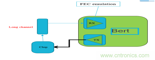 客戶的芯片的接收端可以支持FEC的糾錯(cuò)功能,但要測(cè)試在不同的channel條件和不同的發(fā)送端均衡的設(shè)定下,芯片經(jīng)過(guò)FEC后的誤碼率能降低到多少,如果將信號(hào)直接環(huán)回到芯片的輸入端的話,需要不停的修改芯片的FEC的參數(shù)來(lái)進(jìn)行測(cè)試,但由于其芯片每修改一次FEC的參數(shù)如FEC的symbol size, block size,content size等等都需要重新對(duì)芯片進(jìn)行代碼編譯和下載,每次下載需要幾分鐘的時(shí)間,由于不同的條件都要測(cè)試,則組合數(shù)量很多,導(dǎo)致測(cè)試效率非常低。