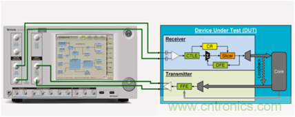 如圖3,除了loopback training以外,另一個(gè)重要的步驟是link training(鏈路協(xié)商),需要Bert和DUT進(jìn)行FFE/DFE的實(shí)時(shí)協(xié)商來(lái)補(bǔ)償鏈路的損耗,以達(dá)到最低的誤碼率。在USB3.1/PCIe協(xié)議中發(fā)送端會(huì)有多個(gè)級(jí)別的FFE來(lái)靈活對(duì)信號(hào)發(fā)送端進(jìn)行均衡補(bǔ)償,在接收端也會(huì)有CTLE和DFE多級(jí)組合來(lái)進(jìn)行補(bǔ)償。(詳細(xì)的鏈路協(xié)商步驟細(xì)節(jié)可以參考泰克的相關(guān)應(yīng)用文章-《克服第4代I/O應(yīng)用中的接收機(jī)測(cè)試挑戰(zhàn)》)。這個(gè)鏈路協(xié)商同樣需要Bert能夠在一定程度上去模擬一個(gè)真實(shí)設(shè)備和被測(cè)設(shè)備進(jìn)行溝通,解析并響應(yīng)被測(cè)設(shè)備的要求去調(diào)節(jié)信號(hào)輸出的FFE參數(shù),并根據(jù)誤碼率來(lái)請(qǐng)求被測(cè)設(shè)備調(diào)節(jié)其輸出的FFE參數(shù)和接收端的CTLE/DFE參數(shù),以達(dá)到最佳的誤碼率。同樣這個(gè)時(shí)候也需要BERT具備單通道直接輸出和接收并解析基于協(xié)議的碼型序列達(dá)到與被測(cè)設(shè)備的實(shí)時(shí)協(xié)商。