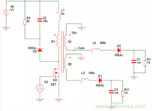 例如,一個反激式電源可分別從一個48V輸入產(chǎn)生兩個1 A的12V輸出,如圖1的簡化仿真模型所示。理想的二極管模型具有零正向壓降,電阻可忽略不計。變壓器繞組電阻可忽略不計,只有與變壓器引線串聯(lián)的寄生電感才能建模。這些電感是變壓器內的漏電感,以及印刷電路板(PCB)印制線和二極管內的寄生電感。當設置這些電感時,兩個輸出相互跟蹤,因為當二極管在開關周期的1-D部分導通時,變壓器的全耦合會促使兩個輸出相等。