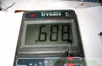 首先我們要先找到基極并判斷是PNP還是NPN管。看上圖可知,對(duì)于PNP管的基極是二個(gè)負(fù)極的共同點(diǎn),NPN管的基極是二個(gè)正極的共同點(diǎn)。這時(shí)我們可以用數(shù)字萬(wàn)用表的二極管檔去測(cè)基極,看圖3。對(duì)于PNP管,當(dāng)黑表筆(連表內(nèi)電池負(fù)極)在基極上,紅表筆去測(cè)另兩個(gè)極時(shí)一般為相差不大的較小讀數(shù)(一般0.5-0.8),如表筆反過(guò)來(lái)接則為一個(gè)較大的讀數(shù)(一般為1)。對(duì)于NPN表來(lái)說(shuō)則是紅表筆(連表內(nèi)電池正極)連在基極上。從圖4,圖5可以得知,手頭上的BC337為NPN管,中間的管腳為基極。