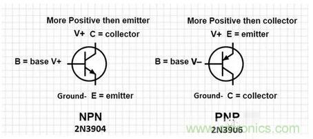 一起來看以上這幅圖中原理圖符號,會注意到如果想要導通一個NPN類的三極管,你需要在基極施加一個正電流。