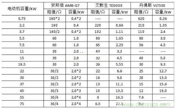 下圖所示為部分變頻器生產廠家提供的制動電阻的阻值與容量。