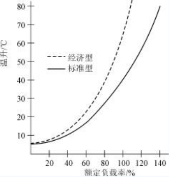 環形變壓器的溫升特性曲線示于圖6,從圖6 可看出環形變壓器的溫升是較低的,對標準型系列,即便是過載120%,溫升也不超過70℃。
