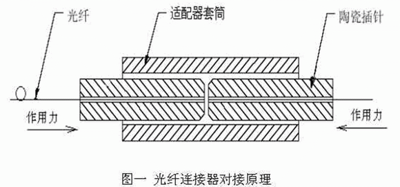 光纖連接器不能單獨(dú)使用,它必須與其它同類型的連接器互配,才能形成光通路的連接,目前,較為流行的光纖連接器裝配和對接方式為:利用環(huán)氧樹脂熱固化劑,將光纖粘固在高精度的陶瓷插針孔內(nèi),然后使兩插針在外力的作用下,通過適配器套筒的定位,實現(xiàn)光纖之間的對接(如圖一)。