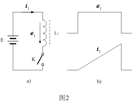 在圖1中,當(dāng)輸入電壓E加于開關(guān)電源變壓器初級(jí)線圈N1的兩端時(shí),由于變壓器次級(jí)線圈產(chǎn)生的電動(dòng)勢(shì)與流過(guò)二極管的電流方向正好相反,相當(dāng)于所有次級(jí)線圈均開路,此時(shí)開關(guān)變壓器相當(dāng)于一個(gè)電感L1。其等效電路如圖2-a) 所示,圖2-b) 是開關(guān)接通時(shí),電感兩端的電壓和流過(guò)電感L1的電流。