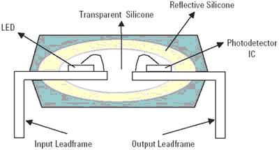 在平面工藝中,LED和IC位于與引線框和焊接線相同的平面中。然后使用一層透明的硅樹脂,以近似圓屋頂形覆蓋LED和IC。硅樹脂提供了光導(dǎo)能力。為防止光逸出,在透明硅樹脂上使用了另一層白漆。因此,來自LED的光會在圓屋頂內(nèi)部反射到IC上。最后,器件使用不透明的澆鑄化合物封裝。