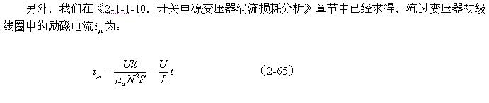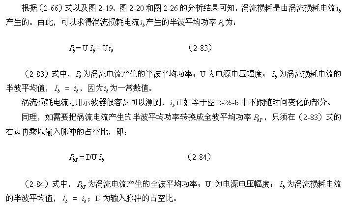 順便指出:(2-84)式的結(jié)果,是認(rèn)為渦流損耗在t1-t2期間(圖2-26-b)完全等于0而求得的,但實(shí)際上,在t1-t2期間變壓器初級(jí)線圈產(chǎn)生的反電動(dòng)勢(shì)同樣也會(huì)在變壓器鐵芯中感應(yīng)產(chǎn)生渦流損耗電流,即當(dāng)輸入電壓為0時(shí)刻,在變壓器鐵芯中還存在很短暫時(shí)間的渦流損耗;由于這種渦流損耗是由反電動(dòng)勢(shì)提供能量來(lái)維持的,它將隨著反電動(dòng)勢(shì)能量的衰減很快就衰減到0。