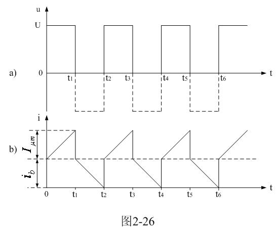 圖2-26是圖2-25電路中變壓器初級(jí)線圈兩端電壓以及電流波形圖。圖2-25中,通過(guò)改變控制開(kāi)關(guān)K的占空系數(shù),可使變壓器初級(jí)線圈正好工作于電流臨界連續(xù)狀態(tài)或電流斷續(xù)狀態(tài),即:流過(guò)變壓器初級(jí)線圈中的電流在下一次控制開(kāi)關(guān)K接通之前為0。