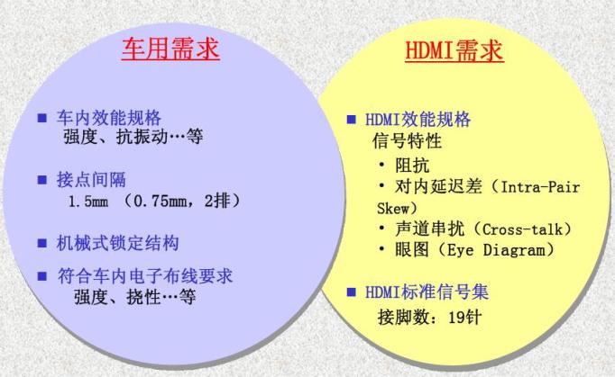 車用視頻系統越來越受歡迎,因此汽車生產商希望在他們的汽車里集成HDMI連接功能。HDMI1.4規格為回應汽車生產商的需求,提出了功能強大的新型車用連接系統,可在車內座椅后方或駕駛面板上的顯示設備上提供真高清視頻,并同時符合汽車道路駕駛中較為嚴苛的性能要求。