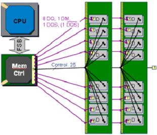 DDR2在DDR的基礎上將芯片接口時鐘頻率提高一倍并將工作電壓從2.5V降低至1.8V,從而使其能在相對更低的功耗下獲得更高的傳輸速率。一般情況下,DDR2的輸入時鐘頻率覆蓋200/266/333/400/533MHz,傳輸比特率覆蓋400/533/667/800/1066Mb/s/pin。相對于DDR,由于速度的提升,DDR2在主板設計要求上也有所變化。內存控制器每Channel可級聯的DIMM數從DDR時期的4到8條減少至2到3條,數據線(DQ)上的終端電阻從主板上的分立電阻搬移到了DRAM芯片內部(ODT),數據同步信號(DQS)由單端信號變為單端或差分可選信號。DDR2主板系統架構如右圖所示。