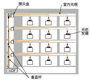 總配線架(MDF)安裝在大樓內(nèi)的公共地區(qū),光纜通過垂直的桿狀物通向各樓層,再通過水平方向上的管道進入房間。