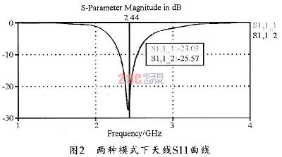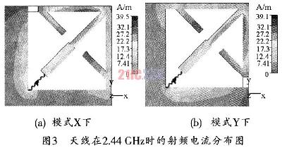 由于兩種工作狀態下,天線的接地端不同,因此,天線的有效輻射部分也有所不同。當處于X模式時,天線結構中垂直部分的微帶線接地,因此,天線的輻射部分應該為水平部分的微帶,天線也相應工作在水平極化方式。圖3所示為天線在2.44GHz時的射頻電流分布圖。