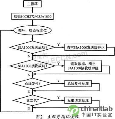 單片機(jī)AT89C52在系統(tǒng)中主要起到一個(gè)橋梁和協(xié)調(diào)控制的作用。主機(jī)通過CH372把數(shù)據(jù)發(fā)送到單片機(jī),單片機(jī)再把數(shù)據(jù)通過SJA1000發(fā)送到CAN總線,從而實(shí)現(xiàn)整個(gè)系統(tǒng)的通信。此外,單片機(jī)還需要對(duì)CH372和SJA1000進(jìn)行初始化,并通過地址/數(shù)據(jù)以復(fù)用的方式訪問CH372和SJA1000。由于在訪問其中一個(gè)芯片時(shí),如果另一個(gè)芯片還保持有輸出,那么單片機(jī)就不能讀到正確的數(shù)據(jù),因此,單片機(jī)要通過片選控制信號(hào)分配有效地址。單片機(jī)主要通過主循環(huán)來監(jiān)控系統(tǒng)的通信,其主循環(huán)流程圖見圖2所示。[page]