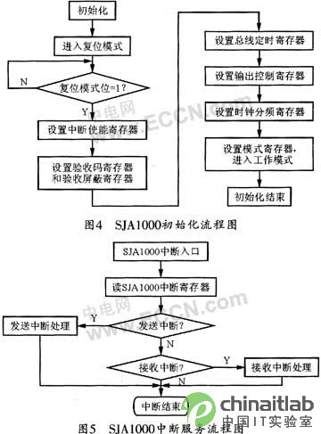 在CAN總線端,單片機(jī)控制著傳輸流程。SJA1000的初始化由單片機(jī)完成,其初始化流程圖見圖4所示,在正常工作模式下,單片機(jī)可控制SJA1000的收發(fā)等操作,以完成和CAN總線的通信。當(dāng)主機(jī)端傳來數(shù)據(jù)時(shí),單片機(jī)將數(shù)據(jù)轉(zhuǎn)發(fā)到SJA1000的發(fā)送緩沖區(qū),并由SJA1000根據(jù)CAN協(xié)議自動(dòng)封裝后發(fā)送到CAN總線上;當(dāng)SJA1000接收到來自CAN總線上的一個(gè)有效的報(bào)文后,系統(tǒng)將在INT引腳上產(chǎn)生一個(gè)硬件中斷信號(hào)(低有效),當(dāng)單片機(jī)收到中斷信號(hào)后,即進(jìn)人中斷服務(wù)程序,以完成數(shù)據(jù)的接收和處理,其中斷服務(wù)流程見圖5所示。