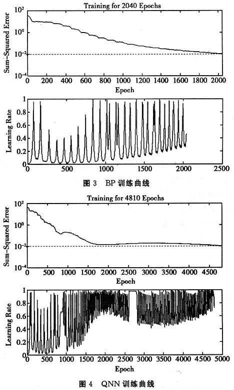 (4)訓練QNN網絡:自適應BP神經網絡在第2040步收斂如圖3,量子神經網絡在第4810步收斂如圖4。