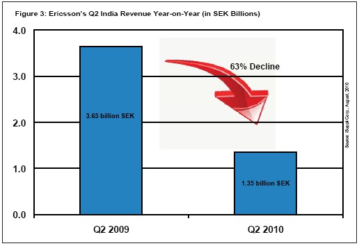 今年7月,諾基亞西門子通信和愛立信報告稱,其第二季度營業收入因印度的審查延誤而大幅減少。諾基亞西門子通信稱減少2.57億美元。愛立信沒有給出具體的損失數字,但該公司在印度的營業收入同比下降63%,相當于總計損失了3.12億美元,如圖3所示。