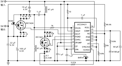 如果USB外設需要5V電源,事情就稍為有些棘手,因為USB口的外供電壓可能略高于也可能略低于這一數值。為此,以往常用先升壓再降壓或先降壓再升壓的辦法。這在需要多種輸出電壓的場合,倒也不失為一條可行途徑;但若僅需單一的5V輸出,此類電路結構便難免“疊床架屋”之嫌?;蛟S正是這一緣故,上述之SEPIC盡管電路復雜,成本也高,但因其能集升壓、降壓功能于一身,所以近來已呈應用漸廣之勢。