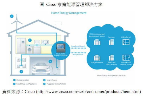 在綠色節能觀念的日益普及趨勢下,有效管理家中用電的家庭能源管理(Home Energy Management,HEM)成為智慧電網公共建設外,另一項具備高度發展潛力的市場領域。面對民眾對節能管理的需求,現階段陸續已有許多國際大廠投入相關應用與服務的研發;除了Google推出PowerMeter的用電監測網路平臺外(需搭配智慧電表或插座等設備),Cisco與Intel也陸續搭上平板電腦熱潮,推出協助民眾管理家庭用電的HEM裝置。相較于Google PowerMeter,Cisco與Intel所推出產品是以物聯網(Internet of Things,IoT)概念為基礎,透過無線網路模式連結家中各項電器設備,進行用電資訊的傳遞與監控,同時進行遠端遙控動作。 Cisco推出包含家庭能源控制器(Home Energy Controller,HEC)與能源管理服務平臺的家庭能源管理解決方案(Home Energy Management Solution,HEMS),作為進入家庭節能市場的第一步。 HEC如同家庭中的監控中心,除了可以在螢幕上即時顯示家中用電的即時狀態資訊外,使用者透過觸控面板的HEC還可以對連線的家電產品進行操控,決定是否關閉或調整特定家電來節省電力消耗。