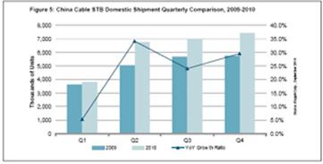 2010年中國有線機頂盒出貨量將達到2510萬個,比2009年的2010萬個增長24.8%。由于各省有線電視運營商加快發展用戶,以及小型運營商推動客戶從模擬向數字服務過渡,預計第二季度創下全年的最強勁增長水平。2010年第二季度有線機頂盒出貨量增長到680萬個,比2009年同期的500萬個增長34%。