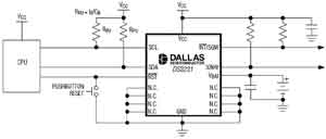 如圖5所示,典型的DS3231應用電路內部集成了晶體,其他電路類似于普通RTC,設計人員無須考慮分立晶體的選擇和布板。因為DS3231包含經過溫度補償校準的振蕩器,可顯著提高RTC的初始精度和溫度穩定性。由于內嵌在封裝內的晶體已經經過高溫老化處理,DS3231與分立的晶體相比具有更好的長期穩定性。精度可以達到±2×10-6,溫度范圍0~+40℃。