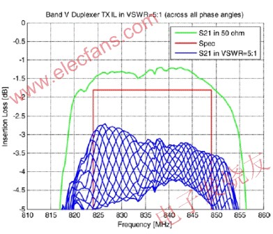 圖3:當(dāng)手機(jī)的窄帶雙工或接收濾波器沒有端接到其特征阻抗時,在通帶中也會出現(xiàn)紋波。本例中,VSWR為5:1的阻抗失配使插入損耗大幅度增加。