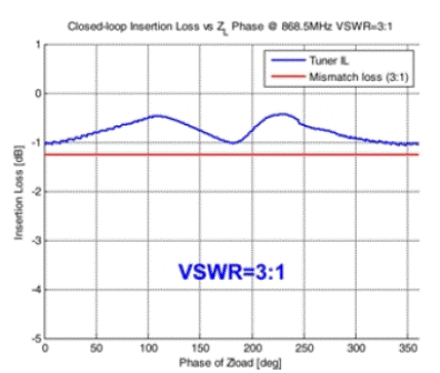 圖4:對自適應(yīng)閉環(huán)系統(tǒng)的仿真顯示,與未使用天線調(diào)諧器的系統(tǒng)(紅線)相比,加入天線調(diào)諧器(藍(lán)線)可降低插入損耗。