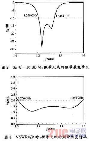 經過多次仿真實驗,發現當W1=6.4mm時,微帶天線可以得到較好的阻抗匹配。1.4雙層微帶天線的仿真結果與分析根據上述各個參量值,采用Ansoft公司的HFSS對本文所設計的微帶天線進行了仿真,仿真結果如下:圖2給出了S11≤-10dB時的微帶天線的頻帶展寬情況,圖3則給出了VSWR≤2時,微帶天線的頻帶展寬情況。