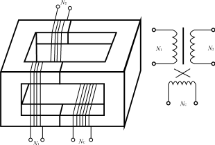 從20世紀80年代末開始,對由垂直形鐵心構成的立體布置的多功能鐵心結構進行研究的人員越來越多。最早是有人把C形鐵心的一半轉90°而形成的,發現在沒轉90°的C形鐵心上的繞組之間仍存在變壓器功能,轉90°的C形鐵心上繞上一個繞組,可以通過電流激磁后,改變沒轉90°的C形鐵心上繞組的電感〔見圖11(a)〕。后來把鐵心去掉一些變成圖11(b),仍然具有這樣的功能。圖11(c)是把兩個變壓器和兩個可控電感組合在一起的多功能鐵心結構。