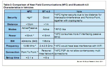 IHS公司預(yù)計,NFC技術(shù)在汽車領(lǐng)域?qū)⑹且豁椦a充性技術(shù),并將與藍(lán)牙和Wi-Fi等目前比較成熟和普及的技術(shù)共存。因此,藍(lán)牙和NFC將互相補充。