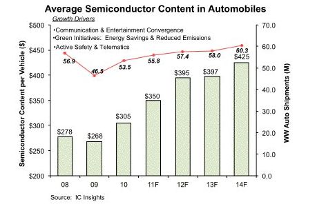據(jù)市調(diào)公司ICInsights報(bào)道,汽車(chē)上裝備電子設(shè)備風(fēng)潮的流行速度已經(jīng)超過(guò)了外界原先的預(yù)期。報(bào)道指出:“過(guò)去只有豪車(chē)級(jí)別的車(chē)型才會(huì)裝備復(fù)雜的電子系統(tǒng),而幾年后的今天,中低檔車(chē)型上裝備復(fù)雜電子系統(tǒng)已經(jīng)成為一種常態(tài)了。”ICInsights公司還因此調(diào)高了其對(duì)今年汽車(chē)用IC市場(chǎng)走勢(shì)的預(yù)期,將平均每輛汽車(chē)上安裝的半導(dǎo)體設(shè)備的價(jià)值調(diào)高到了350美元,比去年的平均值305美元提升了15%幅度。