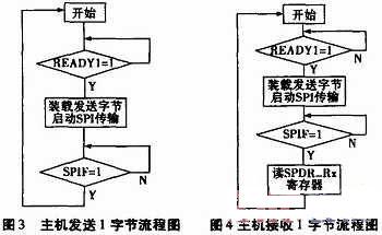 (2)軟件部分:?jiǎn)纹瑱C(jī)為主控制器,首先查詢從機(jī)狀態(tài)標(biāo)志位READY是否為1,判斷是否可以與從機(jī)通信。從機(jī)準(zhǔn)備就緒時(shí),單片機(jī)可裝載1字節(jié)發(fā)送數(shù)據(jù),啟動(dòng)CPLD內(nèi)部SPI接口電路,查詢并等待SPI傳輸結(jié)束標(biāo)志位SPIF為1,完成一字節(jié)數(shù)據(jù)傳輸,如此重復(fù)。圖3、圖4為主機(jī)發(fā)送與接收1字節(jié)流程圖。