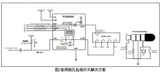 隨著手機制造商對用戶體驗的日益關注與努力提升,一種新的功能器件應運而生:音頻插孔檢測開關。像FSA8008這類檢測開關器件,可連接音頻插孔、基帶和麥克風前置放大器(圖2)。它們主要是解決現有解決方案存在的問題,同時提供更多的功能特性,如節省電路板空間、提高ESD性能、簡單的基帶接口,以及自動復位。