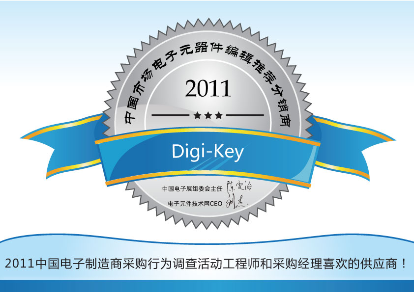 在近日剛剛結束的2011中國電子制造商采購行為調查暨中國市場電子元器件領軍廠商的評選活動中,Digi-key憑借廣泛的電子元器件庫存、最全面的在線資源和快速響應客戶訂單等多方面優勢,以及在工程師心目中形成的良好形象,一舉榮獲2011中國市場電子元器件編輯推薦分銷商稱號!
