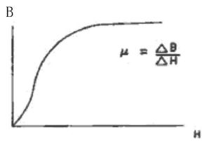對于一種磁性材料來說,磁導率不是一個常數,它與磁場的大小、頻率的高低有關。當鐵氧體受到一個外加磁場(H)作用時,例如當電流流經繞在鐵氧體磁環上的線圈時,鐵氧體磁環被磁化。隨著磁場強度(H)的增加,磁通密度(B)增加。當磁場(H)增加到一定值時,B 值趨于平穩,即達到飽和狀態。對于軟磁材料,飽和磁場(H)只有十分之幾到幾個奧斯特。隨著飽和的接近,鐵氧體的磁導率迅速下降并接近于空氣的導磁率(相對磁導率為 1)如圖 1 所示。