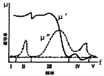 圖 3 是磁導率的頻散特性曲線,它可分為Ⅰ-Ⅴ個區域來分析。可見,在一定的頻率范圍內 μ'''' 值(在某一磁場下的磁導率)保持不變,然后隨頻率的升高磁導率 μ'''' 有一最大值。頻率再增加時,μ'''' 迅速下降。代表材料損耗的虛數磁導率 μ" 在低頻時數值較小,隨著頻率增加,材料的損耗(即μ")增加。