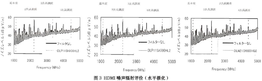 在研究這種方法的過程中,用一根3米長線纜連接兩個HDMI設備,測試從1~5GHz的輻射噪音。表1列出了幾種不同型號共模扼流圈的規格及其參數,它們分別是同樣尺寸(1.25×1.0mm)的DLP11SN900HL2和DLP11SA900HL2,以及2.0×1.2mm尺寸的DLW21SN900HQ2。