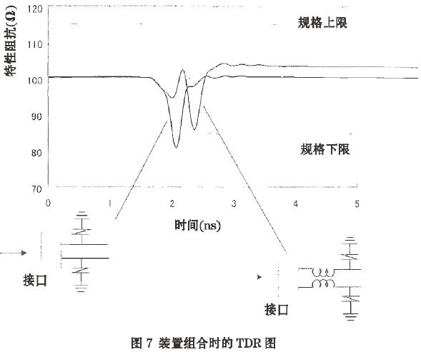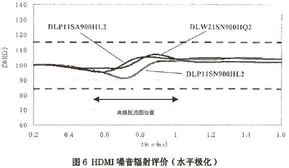 圖6所示的是用一個TDR測量儀器測試共模扼流圈的阻抗。零件的阻抗等于傳輸線的特性阻抗。為了使傳輸信號沒有輻射,阻抗匹配是必須的。圖6同時也顯示了共模扼流圈用于阻抗匹配的評價,符合HDMI標準要求的100+/-15Ω。由于使用了一個ESD器件的電容器,有時會造成阻抗不能滿足標準的需要。在這種情況下,用共模扼流圈加ESD壓敏電阻就可以滿足阻抗匹配標準了。圖7所示為在HDMI接口和1.0PF電容的ESD壓敏電阻之間加一個DLP11SN900HL2的阻抗情況。此時的阻抗已經滿足阻抗匹配標準了。