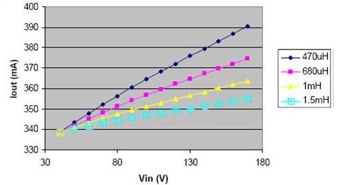 首先,我們來看一下電感的影響,假設(shè)沒有輸出電容(COUT)的存在,這樣負(fù)載電流和電感電流完全一致,能更清楚地說明電感的影響。下圖給出了在輸入電壓的變化范圍內(nèi),電感值對頻率的影響??梢钥闯觯斎腚妷簩︻l率的影響很大,電感值在輸入低電壓時對降低頻率有很大影響。(注:不一定是和參考圖完全一樣,在此只是說明問題)