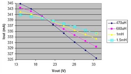 上圖是不同電感值下的頻率響應(yīng)。下圖說明了電感減小時,在輸入電壓的變化范圍內(nèi),負(fù)載電流的變化明顯增大。