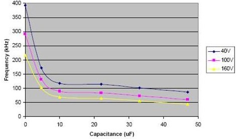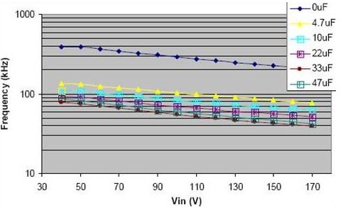 輸出可同時使用輸出電容以達(dá)到目標(biāo)頻率和電流的精確控制。電容能在整個輸入電壓范圍內(nèi)減小頻率,一個小的 4.7μF 的電容就能顯著減小頻率。電流的調(diào)整也能因為電容值的增加而得到改善。從下面圖片可以很容易看到,圖上存在一個拐點,再增加電容值,對操作頻率和輸出電流的調(diào)整影響不大。