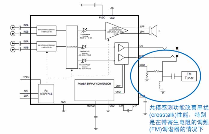 NCP2705也是一款D類音頻管理集成電路,主要功能與NCP2704類似,但NCP2705增加了共模感測功能。此功能可以改善串擾性能,特別是在帶寄生電阻的FM調諧器的情形下。NCP2705的THD+N值更低,耳機放大器為0.01%,揚聲器放大器為0.017%。
